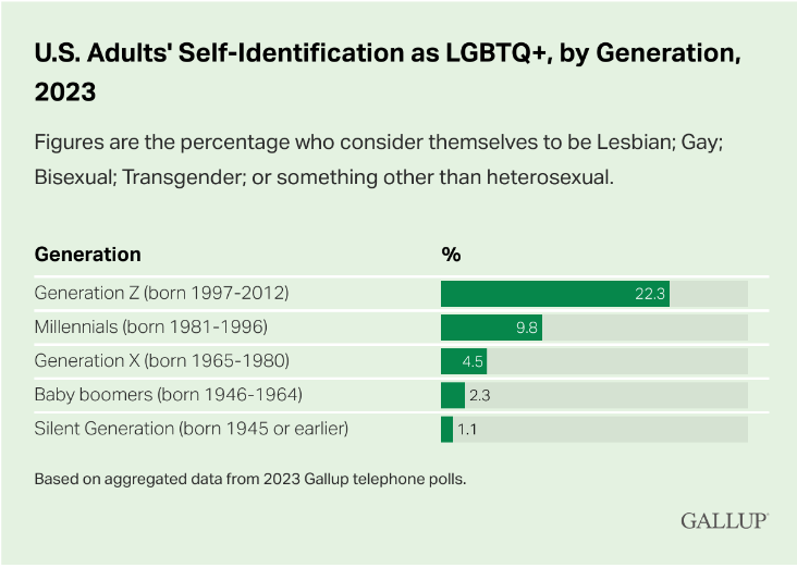Gallup (2024) researcher Jones notes that generation Z and the millennial generation are far more likely than those in older generations to identify as LGBTQ+. Overall, each younger generation is about twice as likely as the generation that preceded it to identify as LGBTQ+. More than one in five Gen Z adults, ranging in age from 18 to 26 in 2023, identify as LGBTQ+, as do nearly one in 10 millennials (aged 27 to 42). The percentage drops to less than 5% of Generation X, 2% of baby boomers and 1% of the Silent Generation. Also from Gallup (2024):